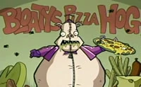 He was originally a hobo; Bloaty was lured into the restaurant with pizza and shanghaied as the mascot, before gorging himself to his current state. Sometimes he comments on his life, like "Bloaty hate his life", and has a very disgusting appearance. He is usually seen with children climbing all over him. He seems to detest his job. He only appeared in person in "Bloaty's Pizza Hog", but has made appearances in all of the Bloaty commercials, such as in "Gaz, Taster of Pork" and Issue 14.